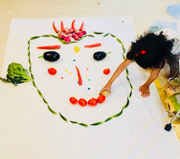 In between, veggie-face — a game a friend invented that I would play with my daughter. We would lay out a clean sheet on the floor and then lay out all our washed and disinfected fruits and vegetables to dry, but in the shape of funny faces. All that I was teaching, all that I was doing, seemed more precious, as well as more urgent, even if more isolated, and more difficult, because of that confluence of the world and the home, because of that confluence of veggie-face and global history. It is hard to work at home, but work made within the constraints of home has a different, and much-needed, flavor.